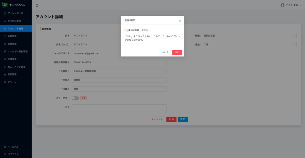 確認画面が表示されますので、「はい」をクリックすることでアカウントの削除が完了します。