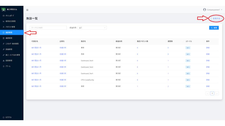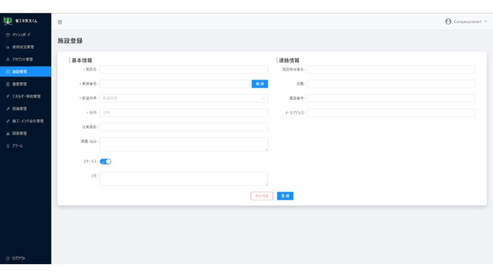 企業管理者ができること 省エネ笑太くんへの貴社施設の登録、および管理方法 2023.07.24 2023.12.04 「施設管理」は、企業が保有している施設に関する重要な情報を効率的に管理し、運用するための機能です。 貴社が保有する施設をご登録いただく事で、保有施設ごとにエネルギー使用量やコストを可視化して運用を効率化することに加え、定期的に行うメンテナンスの日程や突発的に発生した修繕の記録などを管理することが可能です。 目次施設の登録方法新規作成をクリック施設を登録施設の登録方法 新規作成をクリック ダッシュボードの「施設管理」のページから「新規作成」をクリックして新規作成画面を開きます。 施設を登録 施設の所在地や担当者の情報を入力して「登録」ボタンをクリックしてください。